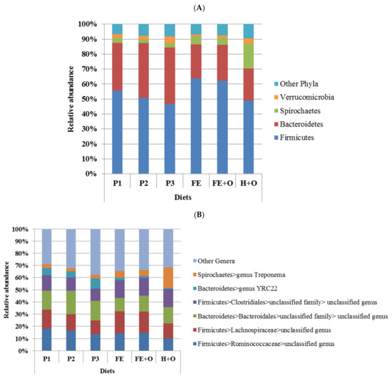 The clustering in beta diversity observed in Figure 2 and Figure S2 was due to significant differences in the relative abundances of bacterial phyla across the diets (Table S4). Despite the differences in relative abundances, the faecal bacterial community across all diets was dominated by the same two phyla, the Firmicutes and the Bacteroidetes, which comprised between 70–90% of the bacterial community, except in the diet containing hay, where Spirochaetes were over-represented (Figure 3A). Diets FE and FE + O had the highest relative abundance of Firmicutes (62–64%), and lowest relative abundance of Verrucomicrobia (~1%), when compared to the other diets. The relative abundance of Bacteroidetes (32–38%) was highest in Diets P1, P2 and P3 (fresh cut pasture), whereas all three conserved forage-based diets (FE, FE + O and H + O) had lower relative abundance of Bacteroidetes (21–24%). Diet H + O had the highest relative abundance of Spirochaetes (17%), when compared to all other diets (Figure 3A, Table S4). These differences in community structure were reflected in similar patterns of distribution in relative abundances at the genus level (Figure 3B). The genus Treponema (Spirochaetes) was highest in Diet H + O, and unclassified genera within the order Clostridiales and family Lachnospiraceae (both Firmicutes) were highest in the Diets FE and FE + O, and the genus YRC22 and an unclassified genus within the order Bacteroidales (both Bacteroidetes) were highest in Diets P1, P2 and P3. p-Values for the comparison of relative abundances of the bacterial genera across diets are shown in Table S5.