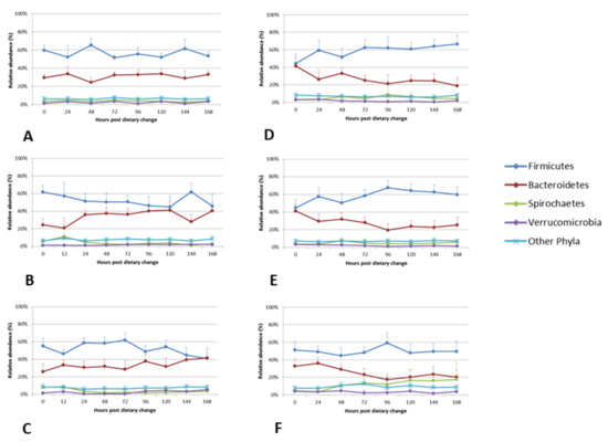 Comparison of the relative abundance of the four most dominant faecal bacterial phyla from 0 to 168 h following dietary change. Mean relative abundances of the four most dominant phyla that comprise the faecal bacterial community of the six horses included in the study are shown in the line graphs. Each panel represents a dietary treatment block. Panel A) Diet P1- cut pasture; Panel B) Diet P2 – cut pasture; Panel C) Diet P3 – cut pasture; Panel D) Diet FE - chopped ensiled Lucerne and Timothy; Panel E) Diet FE+O - chopped ensiled Lucerne and Timothy fed with whole oats; Panel F) Diet H+O - hay fed with whole oats. The time points in hours following dietary change are shown on the x-axis of the primary graph in each panel. Error bars represent the standard deviation (only positive shown).