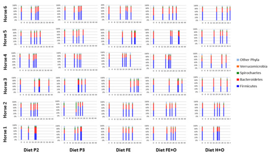 The rarefaction curves generated using the observed species metric for alpha diversity of the bacterial sequences are displayed in Figure S1. Novel OTUs were identified at the end of sub-sampling at 3022 sequences per sample, which may indicate a lack of complete sampling effort. However, the rate of new OTU discovery was relatively limited around that sub-sampling threshold. Good’s coverage estimates on the normalised OTU table indicated that the sampling depth had adequately captured a large part of the OTU diversity in all samples, with the mean coverage being 88 ± 2%. The proximity of the rarefaction curves indicated small variation in the mean number of OTUs observed between the six horses enrolled in the study (682–748 OTUs; difference 66 OTUs; Figure S1A). Greater variation was observed in the mean number of OTUs detected across the diet groups (652–761 OTUs; difference of 109 OTUs; Figure S1B). Horses grazing in a paddock (Diet PP; day 0 samples) had a higher mean number of OTUs detected (761 ± 50 OTUs), than when confined in stables and fed forage-based diets during the study (Diets P1, P2 and P3). The mean number of OTUs detected was similar when the horses were fed cut pasture (Diet P; 727 ± 75 OTUs) and the two ensiled chopped forage diets (Diets FE; 719 ± 99 and FE + O; 719 ± 76), and lowest when the horses were fed hay (Diet H + O; 652 ± 113), indicating some differences in the bacterial diversity across diets. There were also some differences in the number of observed species across time points (Figure S1C).