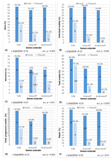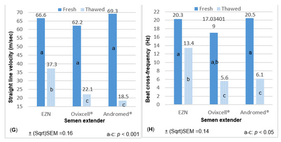 - Ptáček, M.; Stádníková, M.; Savvulidi, F.; Stádník, L. Ram semen cryopreservation using egg yolk or egg yolk-free extenders: Preliminary results. Sci. Agric. Bohem. 2019, 50, 96–103. [Google Scholar] [CrossRef] [Green Version]