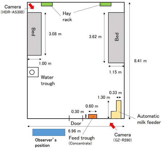 The experimental procedures complied with the Guide for the Care and Use of Agricultural Animals of the Obihiro University of Agriculture and Veterinary Medicine. All methods were carried out in accordance with the university regulations on the Management and Operation of Animal Experiments (accepted No. 18–80). The study was conducted from 18–27 December 2017, in a calf barn with an automatic feeding system at the Field Science Center of the Obihiro University of Agriculture and Veterinary Medicine, Japan. Figure 1 shows the layout of the barn and the position and direction of the fixed cameras. The bed was covered with straw and sawdust. In the barn, cleaning work, such as changing the bedding, was carried out daily for approximately 30 min from approximately 10:00.