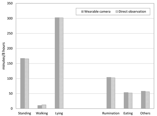 For the posture, lying was observed for 302 min (62.9% of the total 8 h of observation time) by direct observation and 302.5 min (63.0% of the total 8 h of observation time) using the wearable camera.