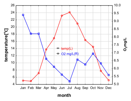 The lowest water temperature was 4.9 °C (February), and the highest was 24.1 °C (July). The highest oxygen content was observed in the winter months (9.41 mg L−1 in January) and lowest in July at 5.19 mg L−1 (Figure 2). Mean water flow rates were 0.54 ± 0.17 (0.41–1.07) m s−1; N-NO3 content 1.81 ± 0.75 mg L−1 (0.92–3.11), N-NH4 0.33 ± 0.17 mg L−1 (0.04–0.57), and P-PO4 0.95 ± 1.06 mg L−1 (0.10–3.35).