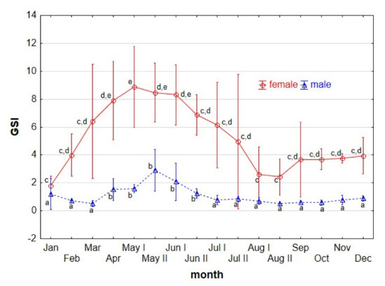 Monthly changes of gonadosomatic index (GSI) of stone moroko. (Pseudorasbora parva) female and male inhabiting the Wardynka river, Poland. Values with different letters show significance differences (p < 0.05; ANOVA test).