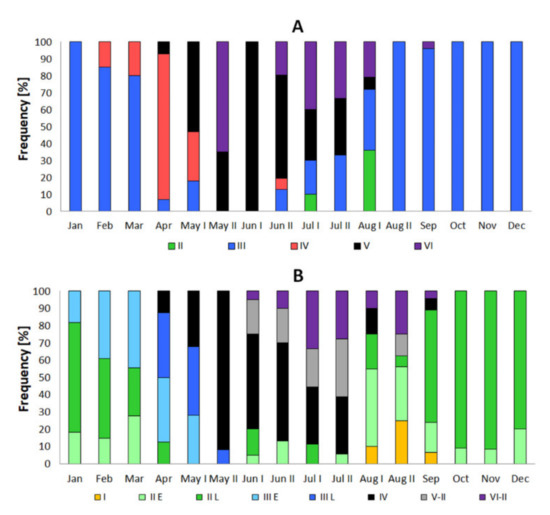 The sexual cycle of males was described using a modified 6-stage scale published in Domagała et al. [35]. For the stone moroko cycle, the overlapping of the gonadal cycles as early as in stage V was designated as substages V-I and V-II.