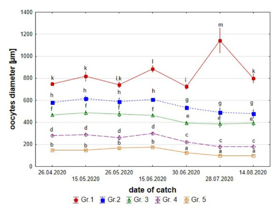 In females collected until mid-June, a lower oocyte diameter was observed in individual groups, which may be linked with the deposition of subsequent egg portions (Figure 6).