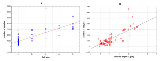 Relationship between number of oocytes and age (A) and standard length (B) in stone moroko Pseudorasbora parva inhabiting the Wardynka river, Poland.