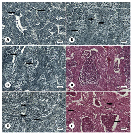 Histology of the gonad in the male stone moroko (Pseudorasbora parva) inhabiting Wardynka river, Poland. (A) gonad in later stage IIL, the tubules contain numerous cyst with multiplying spermatogonia B (arrow), August; (B) Stage IIIE, the meiotic division has begun, and primary spermatocytes were formed in cyst (arrow), January; (C) Stage IIIL, all type of spermatogenic cells are visible in the gonad, first spermatozoa are formed (arrow), April; (D) The spawning stage IV, the tubule lumen is filled with spermatozoa, by the tubule wall numerous cysts with maturing cell occurred, April; (E) The spawning stage V-II, the gonad with finalised spermatogenesis, tubules filled with spermatozoa, the tubule wall contains resting type A spermatogonia and multiplying type B spermatogonia (arrow), June; (F) a spent gonad in stage VI-II. Shrunken tubules filled with unexpelled spermatozoa. The tubule wall contains type A spermatogonia and cysts with type B spermatogonia (arrow), June. Scale bar 20 μm.