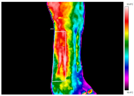 Skin temperature of both the left and right forelimbs was measured using an FLIR E8 infrared thermal (IRT) imaging camera (FLIR Commercial Systems Inc., Nashua, NH, USA) in accordance with published guidelines [27,39] as a pseudo-temperature for tendon temperature. The camera was calibrated within 12 months of use. Data were analysed via dedicated software (ThermaCAM™ Researcher, ThermaCAM™ Researcher, FLIR Systems, West Malling, UK) to allow offline (box measurement) analysis of the region of interest (ROI). Wet Bulb Globe Temperature (WGBT) was measured using a Heat Stress WGBT Meter (Extech Model HT30, ExTech Instruments, FLIR Commercial Systems Inc., Nashua, NH, USA). The IRT camera was turned on for a minimum of 20 min in each condition to allow sensor stabilisation following the manufacturer’s guidelines. Emissivity settings of 0.98 were reported [39]. Markers were used to ensure that the distance between the limb and camera was consistent. Three thermal images were taken of each forelimb (Figure 1) [39] whilst the horse was restrained by a handler, ensuring the limbs had equal weight distribution [43].