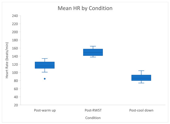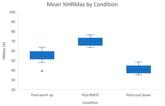 HR was converted to %HRmax for each horse (see Figure 4). Mean %HRmax was also statistically significant across the three active conditions, F(2, 28) = 305.931, p < 0.001, partial η2 = 0.956. There was a statistically significant increase of 15.14% (95% CI [12.86, 19.68], p < 0.01) in mean %HRmax from WU (50.04 ± 5.31%) to RWST (65.18 ± 3.76%), and a statistically significant mean decrease of 27.07% (95% CI [−32.3, −25.88]) to CD (38.11 ± 3.89%).