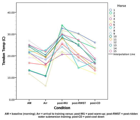 With regard to the effects of RWST on distal limb temperature, mean distal limb temperature fluctuated significantly throughout the five conditions. WGBT/H2O temperature correlated positively in all conditions, with statistically significant correlations in the AM, post-RWST, and post-CD conditions. For the AM condition, our findings support previous studies, which also found a positive correlation at rest between ambient temperature and absolute joint temperature [55]. In conditions Arr and post-WU, the non-significant results indicate the overriding effect of other extraneous factors in these conditions, such as transit and increased physical activity during warm-up.