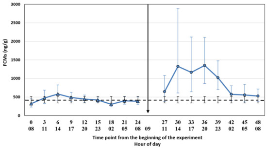 FCM mean concentrations with a 95% CI at each time point from 0 to 48 (blue line) and the baseline average (black dash line) with a 95% CI, both based on a model estimation on a data scale. ACTH was injected between 9:00 and 9:15 (arrow). Control period = time points 0–24 from the beginning of the experiment; Treatment period = time points 27–48 from the beginning of the experiment.