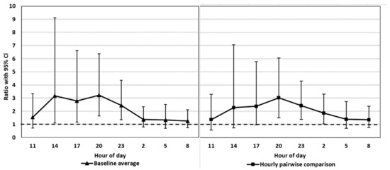 FCM concentrations based on model estimations of the two statistical approaches: 1. Baseline average comparison on the left (Sheet 4 S1) and 2. Hourly pairwise comparison on the right (Sheet 5 S1). Y-axis ratio: mean concentration(s) of control period (dashed line)/mean concentration at each time point of treatment period (95% Cl). The ratio signifies the estimated increase in the treatment period compared to the control period. For example, the peak FCM concentration at 20:00 was 3.2 (baseline average) or 3.0 (hourly pairwise comparison) times higher compared to the reference value from the control period. p < 0.05 if the lower endpoint of the confidence interval stays above 1, e.g., at 20:00 with both approaches.