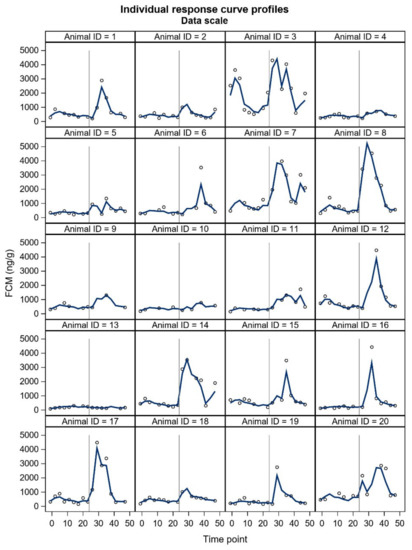 Individual curves of FCM concentrations based on the model estimation. The observations are presented with an open circle. The animal IDs from 1 to 9 represent males and the animal IDs from 10 to 20 represent females. The vertical grey line at time point 25 indicates the time of the ACTH injection.