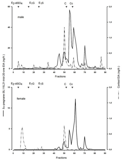 HPLC immunograms revealed that several metabolites were picked up by the EIAs (Figure 4) in both sexes. The utilised 5α-pregnane-3ß,11ß,21-triol-20-one EIA showed higher immunoreactivity compared to the cortisol EIA. Due to their elution position, the main metabolites were unconjugated steroids, but unmetabolised cortisol was absent (or at too low a concentration to be measured).