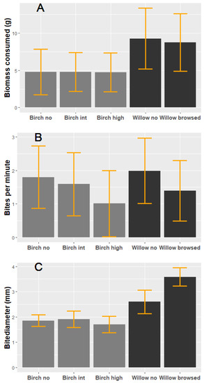 (A) consumption, (B) bites per minute and (C) bitediameter of downy birch (light bars) and goat willow (dark bars) ±95% CI in relation to previous moose browsing. Birch no (0% browsed), Birch int (30% < 60% browsed), and Birch high (>90% browsed). Willow no (0% browsing) and Willow browsed (30% < browsed). Estimates from a mixed effects ANOVA with mountain hare individual as a random term. Note that goat willow and downy birch are run in different models due to differences in browsing categories but plotted together.