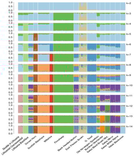 - Tapio, I.; Tapio, M.; Grislis, Z.; Holm, L.E.; Jeppsson, S.; Kantanen, J.; Eythorsdottir, E. Unfolding of population structure in Baltic sheep breeds using microsatellite analysis. Heredity 2005, 94, 448–456. [Google Scholar] [CrossRef] [PubMed] [Green Version]