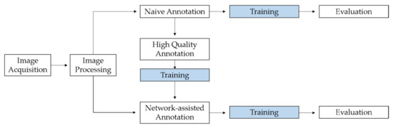 Flow chart showing the various work steps in the study, starting with image acquisition and processing. Processed images were used for naive annotation and network-assisted annotation. In addition, the intermediate step is shown in which high-quality annotations were generated, which were used for additional training of the network. In order to determine the benefits of the intermediate step, the results of the network after the training with naive annotations and with network-assisted annotations were compared.