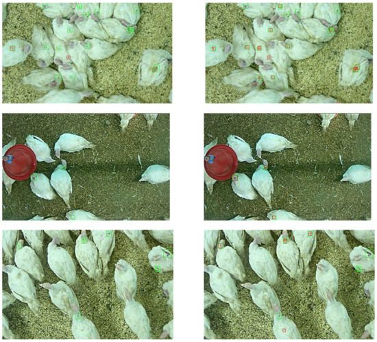 Furthermore, high-stock density, which leads to overlapping and occlusion, has been mentioned as a reason for the complicated annotation of images showing poultry [32]. The recordings in the flock (not under laboratory conditions) indicated that environmental impacts, such as drinkers, feeders, and/or feathers on the ground could negatively influence the performance, especially of the network detection (see Figure 2).