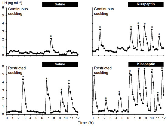 Examples of pulsatile LH secretion in postpartum anestrous ewes that were continuously suckling and infused with saline (top left), or kisspeptin (top right), or were suckling-restricted and infused with saline (bottom left) or kisspeptin (bottom right). The bars indicate the period of infusion. Asterisks indicate detected pulses.