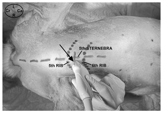 Transverse ultrasound-guided approach to the transversus thoracis plane at the level of the fifth interchondral space in dogs. The transducer was positioned parallel to the fifth and sixth costal cartilages, with the marker located medially and orientated in a caudolateral to craniomedial to direction. The black arrow indicates the direction of the needle in an in-plane technique. Ca, caudal; Cr, cranial; L, left; R, right.