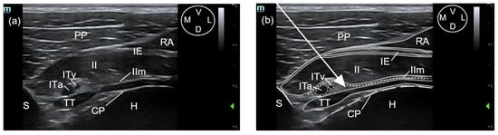 (a) Ultrasound image of the fifth interchondral space in a canine cadaver, showing the anatomical structures observed during the transverse approach to the transversus thoracis plane (t-TTP). (b) The same ultrasound image with the edges of the muscular structures (solid grey lines), the internal intercostal membrane (short dashed white lines), fifth sternebra (solid white line), vascular structures (short dashed grey lines) and costal pleura (long dashed lines) superimposed to facilitate their identification. The white arrow shows the needle pathway and the needle tip located into the transversus thoracis plane. CP, costal pleura; D, dorsal; H, heart; IE, external intercostal muscle; II, internal intercostal muscle; IIm, internal intercostal membrane; ITa, internal thoracic artery; ITv, internal thoracic vein; L, lateral; M, medial; PP, pectoralis profunda muscle; RA, rectus abdominis muscle; S, Sternum; TT, transversus thoracis muscle; V, ventral.