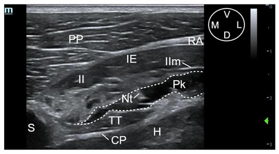 Ultrasound image of the pocket of fluid formation after the injection of a methylene blue-lidocaine solution using the t-TTP approach, at the level of the fifth interchondral space. The pocket of fluid is delimited by the dotted line. CP, costal pleura; D, dorsal; IE, external intercostal muscle; II, internal intercostal muscle; IIm, internal intercostal membrane; L, lateral; M, medial; Nt, needle tip; Pk, pocket of fluid, PP, pectoralis profunda muscle; RA, rectus abdominis muscle; S, sternum; TT, transversus thoracis muscle; V, ventral.