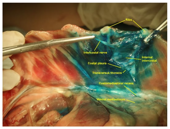 The use of thawed cadavers is considered by the authors as one of the main limitations of this study, as it could produce differences in the spread of the injected solution compared with its administration in live animals [29]. Moreover, the use of methylene blue as the only dye injected might create confusion when evaluating which structures have been stained with both injectable volumes, mainly the presence of dye into the mediastinum. Although the lidocaine-methylene blue mixture is frequently used in similar cadaveric studies, we consider this to be another limitation of the study because the effects of a methylene blue solution on the physical properties and spread of a local anaesthetic solution are unknown [30,31]. Another limitation could be the ventilatory expansion of the thoracic cage in live animals, which could impair the execution of the approach. Spinal needles were used in this study because economic reasons, although the authors recommend the use of less traumatic needles, such as Tuohy, in live animals to prevent tissue injury.