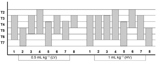 A solution of 200 mL of lidocaine (Lidocaine 2%, B. Braun Melsungen AG, Melsungen, Germany) and 0.2 mL of methylene blue was prepared and 0.5 mL kg−1 (LV) and 1 mL kg−1 (HV) were loaded in two syringes for each of the eight canine cadavers. One of the two volumes was injected into the TTP in one side of the thorax and the other into the contralateral side, after a randomization performed using Microsoft Excel for Windows Version 2103 (Microsoft Corporation, Redmond, WA, USA). The investigator who performed the anatomical dissections (M.A.) was different from the one that injected the solution (C.L.), being the first one blinded to the injection side randomization.