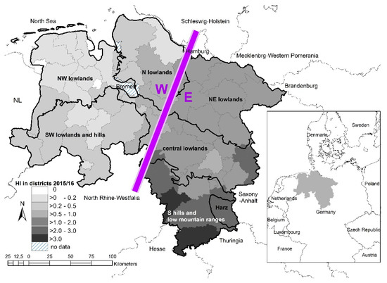The state’s administration is structured into 427 municipalities which form 46 districts. The human population density is 160 inhabitants/km2. In this region, the human population’s moods and opinions are as diverse as the variety of landscapes which allows also for comparison with other human populations in other regions. The landscape is formed by several different macrochores (main physical-geographic regions, Figure 1). Three-quarters of the area are formed by the North German Lowlands with natural sceneries such as the Wadden Sea and marshes in the north; intensive agrarian landscapes with crop fields and grassland, some heath, moor and bushlands, as well as smaller forests on flatlands with gentle hillocks, make up the northern and western parts (containing the macrochores: N northern lowlands, NW north-western lowlands, SW south-western lowlands and hills). The mean hunting index (HI = dead individuals/km2) in this sector was <1. The centre is made up of strongly agriculturally-dominated areas (CL central lowlands), as well as more forested areas on the gentle hills of the Luneburg Heath (NE north-eastern lowlands) in the east (HI > 1–3). The remaining quarter (HI > 1–4) is formed by forested areas, also containing agriculture, on the low mountain ranges (S southern hills and low mountain ranges) up to the Harz (H) Mountains in the south (Wurmberg 971 m asl) (in the following mainly combined as S + H). Agriculture forms 60% of the area of Lower Saxony, 22% is forested, 2% is fresh water, and 16% are of anthropogenic origin (settlement, industry, traffic, etc.; no hunting allowed). A total of 29% of the forested areas (7% of the total area) are managed by the Forestry Offices of Lower Saxony, which contribute about 15% of the annual hunting bag of Lower Saxony. The climate is temperate on the transition zone between the Atlantic in the northwest, with a continental climate in the east. The average annual temperature is around 8 °C. The rainfall ranges from 500 mm per year in the east to 800–900 mm in the northwest and up to 1000–1600 mm at the western slopes of the Harz Mountains.