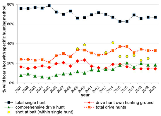 Development of proportions of the hunting methods single and drive hunt (shot animals as % of total hunting bag per hunting method) as a mean for Lower Saxony from 2001–2019 (2001 means hunting year 2001/02: 1 April–31 March). N = min 7286, max 8255, database: WTE 2002–2020. Bait was only surveyed in the shown years. Data only from WTE, as not available from official hunting bag data. Compare also Figure 3.