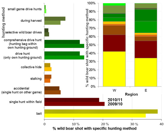 Percentages within hunting bag, wild boar shot with different hunting methods/strategies (predetermined answers). large graph: proportions total in Lower Saxony within the years 2009/10 (lower bar, N = 8106) and 2010/11 (upper bar, hatched colour, N = 8023), database: WTE 2010 + 2011; small graph: proportions in low (west = W, districts’ hunting index HI < 1 shot/km2) and high (east = E, HI > 1) density regions (2009/10), database: WTE 2010.
