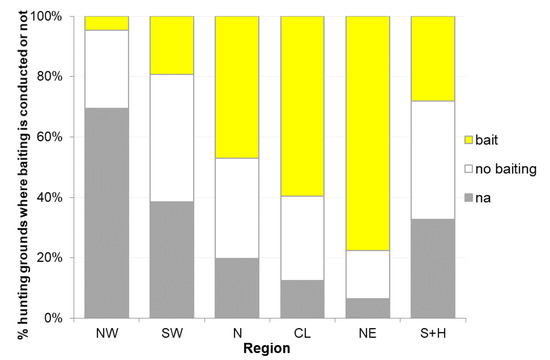Percentages of hunting grounds with or without baiting for wild boar, N = North, S = South, W = West, E = East, CL = central Lowlands, H = Harz mountains, na = not answered. N = 7429, database: WTE 2012, singular query in 2012.