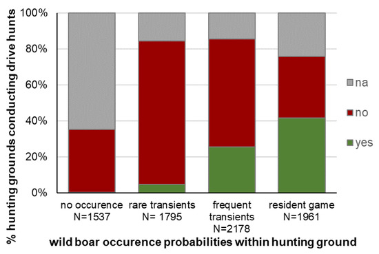 Percentages of hunting grounds conducting drive hunts on wild boar within different wild boar occurrence probabilities, na = not answered. N = 7907, database: WTE 2012, singular query in 2012.