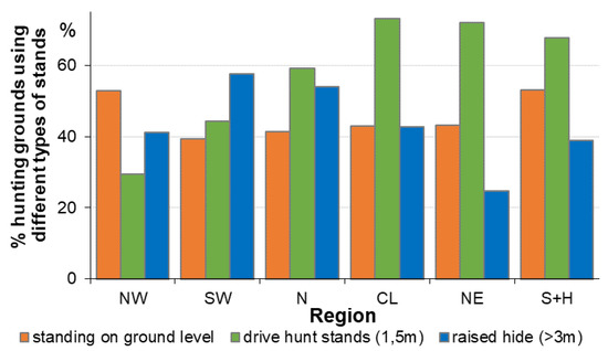 For regions with low wild boar densities (N north, NW northwest, SW southwest, see Figure 1) there seems to be no tradition for drive hunt stands and these hunters use existing structures (raised hides) regularly, or just shoot on the ground level during drive hunts. Transportable stands could help increase the proportion of highly effective drive hunt stands (better than raised hides for the moving game) and ensure security (better than ground level stands).