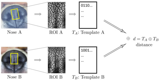 The second column shows the ROI of each dog from which the template is created. Template is created from ROI A, and Template from ROI B. These two templates are then compared by using the well-known Hamming distance [34,35]. The resulting Hamming distance is called the matching distance, and is denoted by . This matching distance is usually called the matching distance between the two nose images Nose A and Nose B, although technically the matching distance computation involves only template of ROI A and of ROI B. This matching distance measures how similar these two templates, and hence the two nose images, are. In general, the smaller the matching distance is, the more similar the two nose images are; the greater the matching distance, the more dissimilar the two nose images.