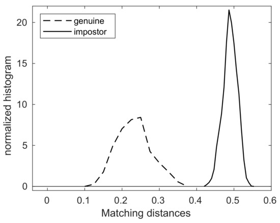 Figure 3 also shows the graphs of the normalized histograms (probability distributions) of genuine and impostor matching distances, and note that the threshold value separates these two graphs of probability distributions.