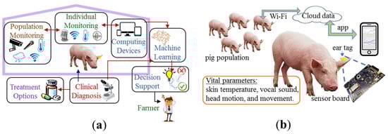 Overall theme for behavioral health monitoring in pig farms: (a) the pig farm is equipped with technologies to monitor individual animals and populations with mobile devices, data computing and storage units, machine learning, decision support tools, clinical diagnosis, and treatment options; (b) our measurement setup is shown. The ear tag with sensor board is attached to the ear lobe of individual pigs to measure vital parameters and send the data through a smartphone app to the cloud.