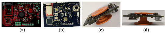 Prototype design and assembly: (a) CAD layout of the electronic sensor board; (b) the fabricated PCB with soldered electronic chips; (c,d) inclined view and side view of an assembled sensor board sandwiched between the orange-colored ear tag.