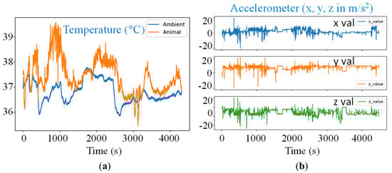 Time-series data recorded from pig testing using the electronic sensor board. Sample data from the animals is shown here as obtained from the on-board (a) temperature sensor and (b) 3-axis accelerometer. The sound sensors collected the baseline curves, but there were no useful events (e.g., coughing or screaming) during the recorded time period.