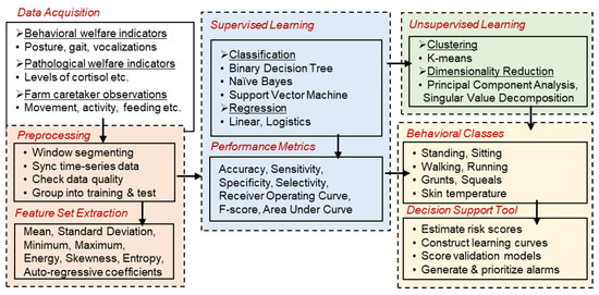 A single behavioral health indicator can misjudge the well-being status, and therefore, a realistic set of indicators are required for accurate assessment [22]. In this context, machine intelligence is valuable to assimilate and process data from multiple sensors and human observations for subsequent decision support [8,23]. Currently, our data collection activities are underway with the intent to generate sufficiently large datasets to map the raw sensors’ data into predictable behavioral traits, as described in Figure 5. Here, the activity sensors measure the raw data related to posture and gait (e.g., the nature, duration, rate, and ease of events). Thereafter, machine intelligence based on linear regression will be used to analyze the raw data and distinguish different postures and gaits. The sound sensors measure vocalization in terms of the call duration, call rate, main frequency, peak amplitude, and peak frequency. This will help to distinguish the nature and type of call. Abnormal behavioral traits could include prolonged rest, reduced eating and drinking, lameness, pain, aggression, escape events, screams, coughing, and fever. These abnormal traits could be identified by machine learning algorithms such as random forest, decision tree, K-nearest neighbor, support vector machine, artificial neural networks, naïve Bayes, linear regression, logistic regression, and gradient boosting.