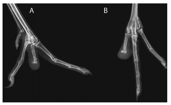 (A) Lateral and (B) dorsoplantar radiographs of the right foot of Case 2, a 31-year-old male Siberian crane (Leucogeranus leucogeranus) with probable osteomyelitis of the third digit of the right foot at time of presentation.
