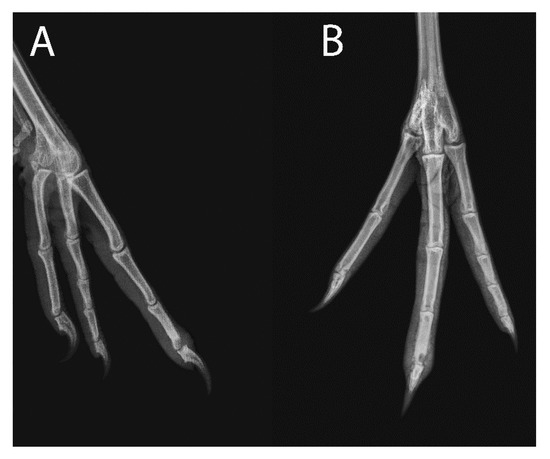 Case 3, an 11-year-old male wattled crane (Bugeranus carunculatus), presented with an approximately 6 cm × 3 cm scabbed wound on the ventral aspect of the left carpus that exuded synovial fluid on carpal extension. Radiographs showed potential mineralization of the soft tissue surrounding the carpus and an irregular margin and radiolucency of the left proximal alula, suggestive of osteomyelitis (Figure 3). A CBC and biochemistry panel were within reported reference intervals [8]. Ceftiofur (Excede, Zoetis) was provided at 21 mg/kg IM q4d for 2 doses. On day 4, the bird was anesthetized with isoflurane and a fluctuant swelling was noted on the palmar aspect of the carpus. Carpal arthrocentesis yielded cloudy synovial fluid; cytological analysis showed degenerate heterophils with Gram-negative, rod-shaped bacteria. An aerobic culture of the fluid isolated Acinetobacter sp. and Enterobacter sp., both of which were resistant to beta-lactam antibiotics and susceptible to fluoroquinolones and aminoglycosides (Supplementary Culture Report S1). Regional limb perfusion was performed on the left wing by manually occluding the left ulnar vein approximately 2 cm proximal to the elbow against the underlying bone on the ventral aspect of the wing, and serial infusion of the following: amikacin sulfate (Amiglyde-V, 250 mg/mL, Zoetis; 10 mg/kg IV), flunixin meglumine (Banamine, 50 mg/mL, Merck Animal Health, Summit, NJ 07901, USA; 1.25 mg/kg IV), and saline with a 23-ga butterfly catheter and allowed to infuse for 15 min. Hemostasis of the ulnar vein was achieved through manual pressure with gauze for approximately 1 min following RLP. No leakage from the vessel was confirmed visually. Consideration was given to using a penrose drain as a tourniquet around the proximal wing, but the presence of the patagial ligament was thought to prohibit adequate occlusion. Saline at 62.5 mL/kg SQ was administered following the procedure. Based on culture and sensitivity results, ceftiofur was discontinued and oral marbofloxacin was started (Zeniquin, Zoetis; 75 mg PO q24h × 40 days). On day 9, the swelling on the dorsal aspect of the carpus was subjectively reduced and the animal had normal left wing carriage. On day 23, prolific granulation tissue was present over the wound, and synovial fluid could still be expressed from it. A second RLP procedure was performed with amikacin sulfate (Amiglyde-V, 250 mg/mL; 10 mg/kg IV) followed by saline 3 mL IV in the same manner as the first procedure, but without flunixin meglumine. After cleaning with dilute chlorhexidine (MWI Animal Health, Boise, ID 83705, USA) and application of topical gentamicin/betamethasone (GenOne Spray, MWI Animal Health), the wound was then covered with a non-adherent dressing and transparent film dressing (Tegaderm Film 3M Healthcare, St. Paul, MN 55144, USA). A recheck exam on day 30 showed no swelling around the left carpal joint and the wound had healthy underlying granulation tissue with serosanguinous discharge. A repeat biochemistry panel showed the uric acid was still within reference range [8]. On day 51, the left carpal wound was significantly smaller in size (approximately 2.5 cm × 1.5 cm) with no soft tissue swelling or expressible synovial fluid on palpation. Radiographs performed under general anesthesia with isoflurane showed sharper demarcation and resolution of radiolucency of the proximal alula. A repeat biochemistry panel was within reported reference intervals [8]. Oral marbofloxacin therapy was discontinued and a recheck examination on day 81 showed almost complete healing of the left carpal wound with a small, superficial scab and feather regrowth. Sixteen months post-treatment, this bird had no recurrence of the left carpal wound or osteomyelitis, radiographs showed good remodeling and resolution of the irregular alular margins, and a biochemistry panel was within reported reference intervals [8].