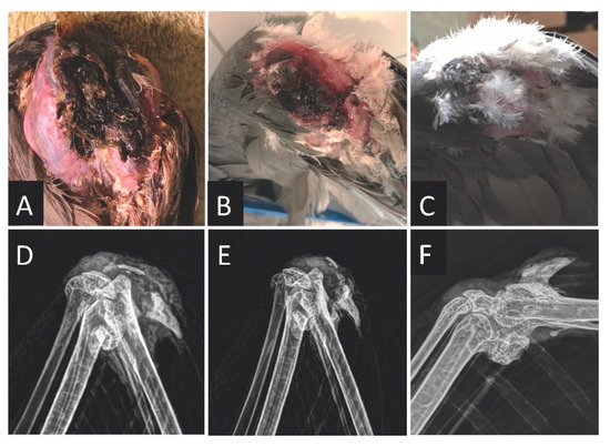 The left carpus of Case 3, an 11-year-old male wattled crane (Bugeranus carunculatus), with septic arthritis and suspected alular osteomyelitis at the time of presentation and after treatment with intravenous antibiotic regional limb perfusion. Palmodorsal (PD) photographs of the wound (A) 4 days after presentation, (B) 6 weeks later, and (C) 10 weeks after presentation. PD radiographs (D) at the time of presentation, (E) 6 weeks later, and (F) 16 months after presentation.