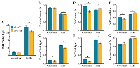 Effect of dry period heat stress on milk yield and composition. Multiparous Holstein cows were exposed to dry period heat stress (dry-HT, shade only, n = 12) or cooling (dry-CL, shade, fans, and water soakers, n = 12) for 46 days before calving. After calving, all cows were actively cooled and colostrum and milk yield (A) and composition (i.e., protein (B,C), fat (D,E), fat:protein ratio (F) and lactose (G)) were measured daily and averaged weekly in AfiFarm up to 210 DIM. Composition is reported as content (%), ratio, or yield (kg/day; calculated from milk yield). All data are presented as least square means ± standard error of the treatment. * indicates p ≤ 0.05; # indicates 0.05 < p ≤ 0.10.
