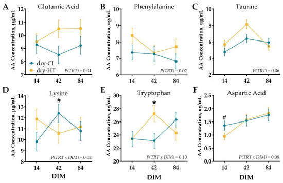 Plasma free AA concentration at 14, 42, and 84 days in milk (DIM). Cows were exposed to dry period heat stress (dry-HT, n = 5) or cooling (dry-CL, n = 5) for 46 days pre-calving. Blood was collected at 14, 42, and 84 DIM, and plasma was analyzed for free AA concentration. Amino acids that differed between treatments (TRT, A–C) or treatment × DIM interaction (D–F) are depicted with significant contrasts denoted by * (p ≤ 0.05) or # (0.05 < p ≤ 0.10). All data are presented as least square means ± standard error of the treatment × time interaction.