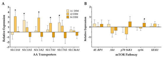 All mammary AA transporters evaluated herein, except for SLC36A1, had a treatment by DIM interaction whereby dry-HT cows had upregulated expression of AA transporters at either 14 or 42 DIM only (p (TRT × DIM) ≤ 0.03; Figure 3A, Supplementary Table S3). The treatment by DIM interaction was a stastitical tendency for SLC1A5 and SLC7A5 (p (TRT × DIM) ≤ 0.08). More specifically, dry-HT cows had increased mRNA expression of SLC1A1, SLC3A2, and SLC7A1 at 42 DIM relative to dry-CL cows (p ≤ 0.05; Figure 3A). The transporters SLC1A5 and SLC7A5 were significantly upregulated and tended to be upregulated, respectively, at 14 DIM in dry-HT cows relative to dry-CL cows (p = 0.04 and p = 0.10; Figure 3A). There was also a DIM effect for SLC1A5, 3A2, 7A1, and 7A5 (Supplementary Table S3).