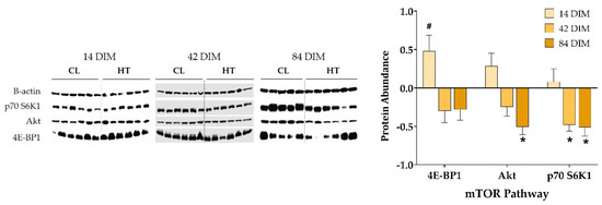 mTOR pathway protein abundance. Cows were exposed to dry period heat stress (dry-HT, n = 6) or cooling (dry-CL, n = 5) for 46 days pre-calving. Mammary biopsies collected at 14, 42, and 84 days in milk (DIM) were used for protein extraction to analyze mTOR pathway protein abundance by western blotting (Original picture, please see File S1). Protein expression is reported as abundance of dry-HT cows relative to dry-CL cows, normalized to β-actin. All data are presented as least square means ± standard error. * indicates p ≤ 0.05; # indicates 0.05 < p ≤ 0.10.
