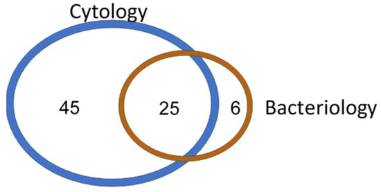 Venn diagram of the distribution of cows based on their cytology (≥6% of PMNL) and bacteriology results (VBLAB; reference test).