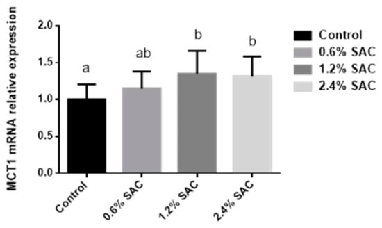As shown in Figure 1, pigs fed 1.2% and 2.4% SAC diets showed a higher MCT1 mRNA expression (p = 0.04) in the colon than in the control diet.